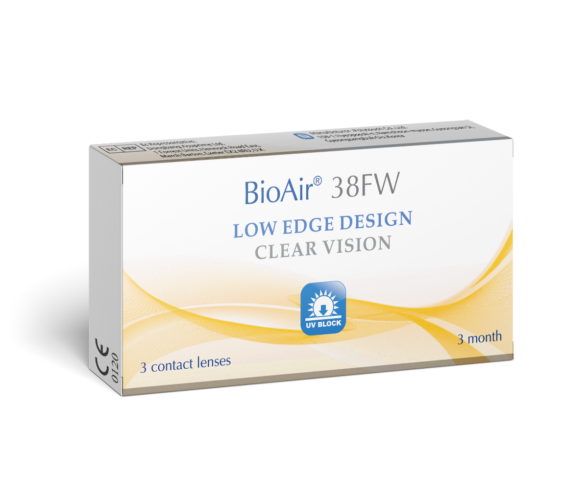 Soczewki BioAir 38FW zapewniają znakomity komfort, wysoką zawartość wody, blokadę przed promieniowaniem UV oraz łatwość aplikowania dzięki specjalnemu zabarwieniu na niebiesko. Dzięki udoskonalonej technice szlifowania krawędzi soczewki, zachowuje ona przez cały okres używania soczewki, właściwości zwiększające komfort noszenia.